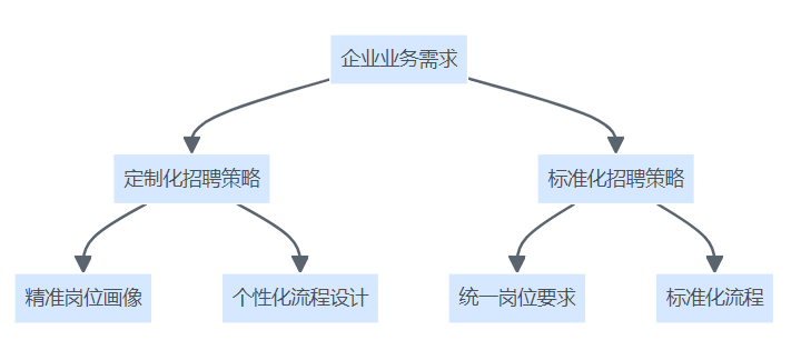定制化招聘和标准化招聘在策略与目标上的流程分布对比,展示两者如何根据企业业务需求进行不同的招聘设计。
