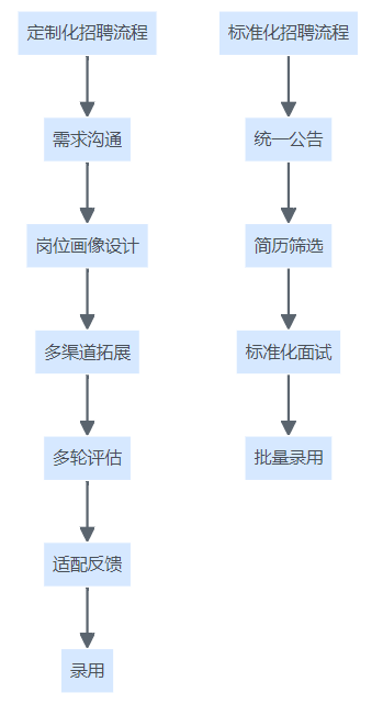 定制化招聘流程包含需求沟通、岗位画像、多渠道拓展等灵活环节;标准化招聘流程以公告、筛选、面试和批量录用为主,两者流程结构清晰对比。