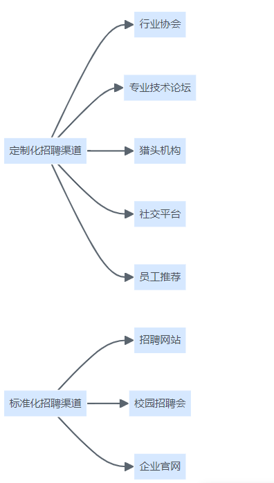 定制化招聘渠道涵盖行业协会、技术论坛、猎头、社交平台和员工推荐,标准化招聘渠道以招聘网站、校园招聘会和企业官网为主。