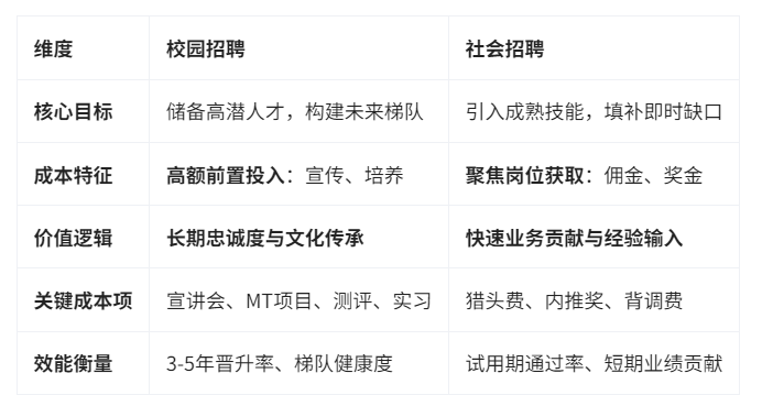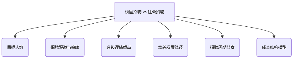 校园招聘与社会招聘绝非简单的“新人”与“老人”之别,其在目标设定、渠道运营、评估逻辑、培养投入、周期管理、成本构成等六大维度存在系统性差异。试图用同一套模式驾驭两者,无异于缘木求鱼。