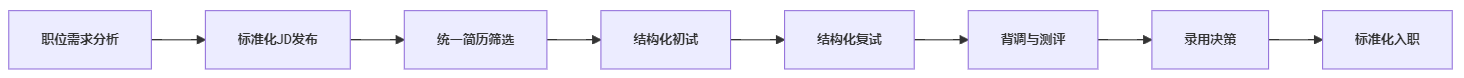 结构化招聘的核心特征在于其高度标准化与流程化。整个招聘旅程被预先分解为清晰、可复用的阶段节点:职位需求分析、人才画像建模、标准化渠道发布、统一简历筛选、结构化面试评估(使用一致的题库与评分表)、背景调查、录用决策直至入职管理。每个环节均设定明确的输入输出标准与流转规则,形成一条环环相扣的“人才生产线”。