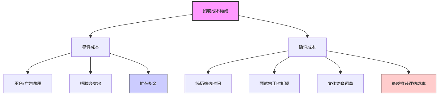 图示说明: 推荐招聘核心成本集中于奖金(可控显性支出)与文化运营(关键隐性投入);公开招聘则在平台费用与海量简历处理等隐性成本上负担更重。红海eHR通过自动化流程降低隐性损耗。