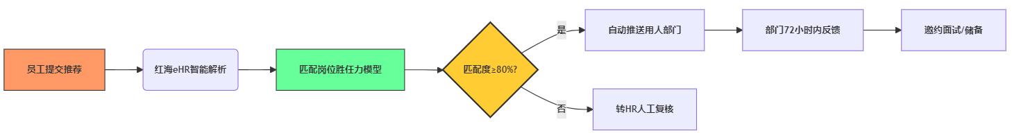 图示说明: 红海eHR通过AI预筛与模型匹配实现推荐人才快速流转,将低匹配度推荐自动拦截,确保用人部门聚焦高质量候选人评估。