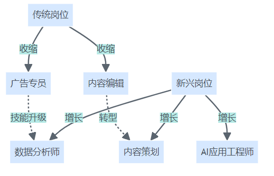 数字营销行业岗位结构变化流程图,展示传统岗位收缩与新兴岗位增长