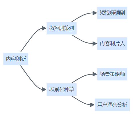内容创新驱动下数字营销岗位分布结构图,涵盖微短剧策划和场景运营岗位