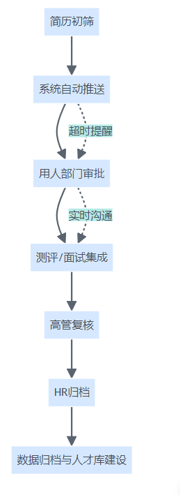 核心功能:简历解析、流程自动化、审批流配置、多渠道通知、数据归档与统计分析。