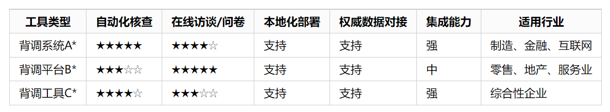 | 背调软件A* | 学历/履历自动核查 | 大型制造、金融 | 高 |