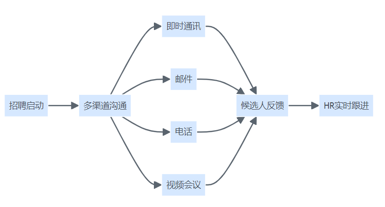 招聘各阶段分别采用即时通讯工具、邮件、电话、视频会议组合,及时回应候选人疑问。