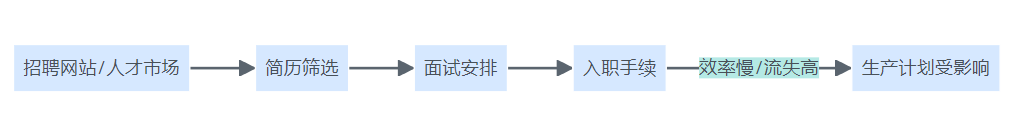 传统招聘流程通常包括简历筛选、面试安排、入职手续等多个环节。旺季时,HR团队因人手不足,审核速度慢,甚至需要加班才能完成初筛,人岗匹配效率降低,影响生产计划。
