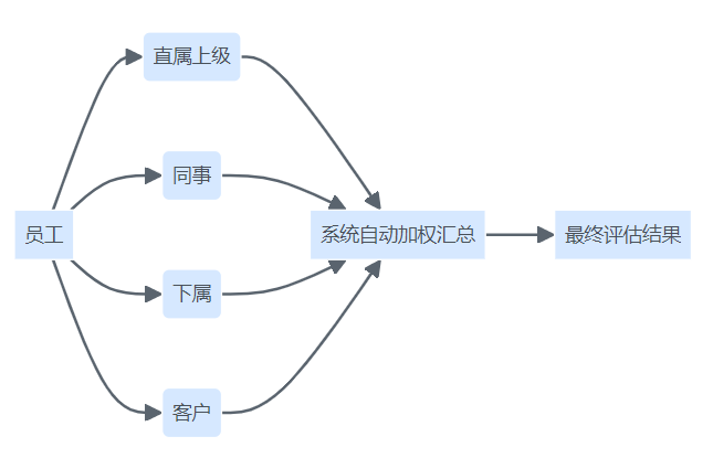 多元化评估主体流程结构图,展示员工接受不同主体评价后,系统自动加权的评估流程