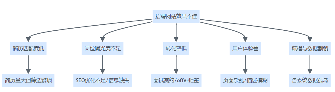 招聘网站效果不佳的成因结构图,包含简历匹配度低、曝光不足、转化率低、用户体验差、流程数据割裂等核心问题。