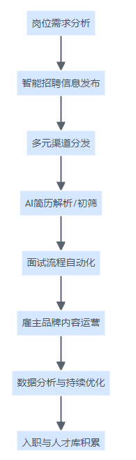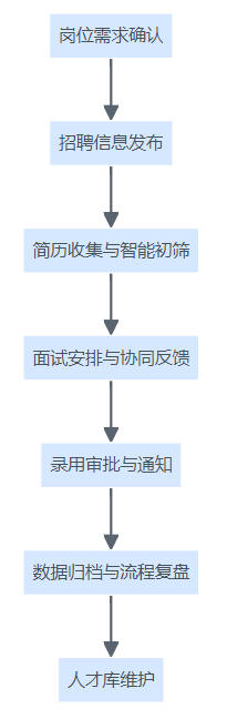 招聘流程优化示意图,从岗位需求确认到人才库维护,涵盖信息发布、智能筛选、面试协同、数据归档等关键流程节点。