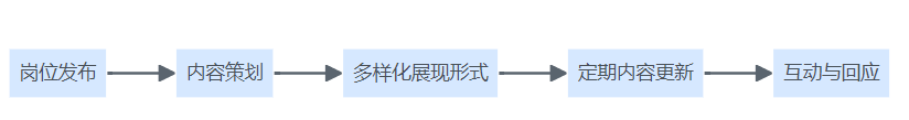 社交媒体招聘内容优化流程结构图,展示从岗位发布、内容策划到多样化展现形式、定期更新及候选人互动的闭环流程。