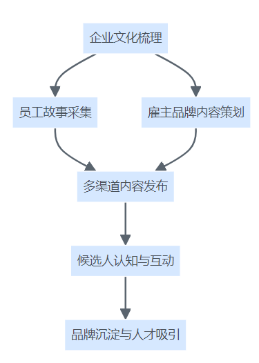 企业文化传播与雇主品牌建设流程结构图,从文化梳理、员工故事到多渠道发布、互动与品牌沉淀,形成良性循环。