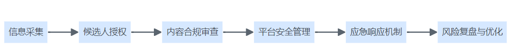 社交媒体招聘风险防控与合规管理流程图,涵盖信息采集、授权、内容审查、安全管理、应急响应与复盘等环节。