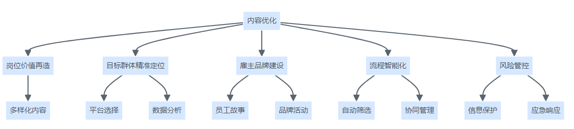 社交媒体招聘优化结构图,展示从内容优化、群体定位、品牌建设、流程智能化到风险管控的全流程体系。